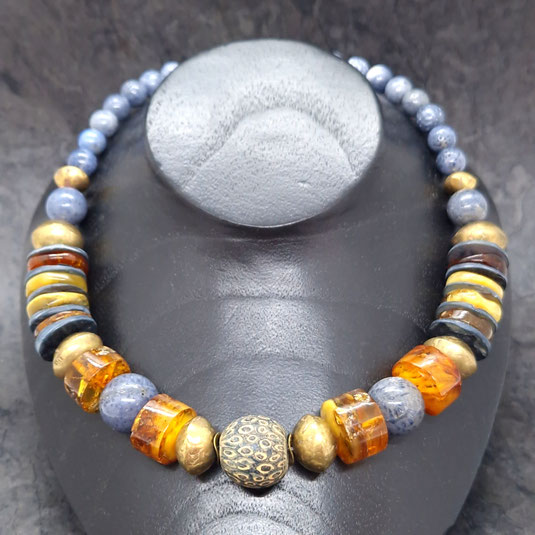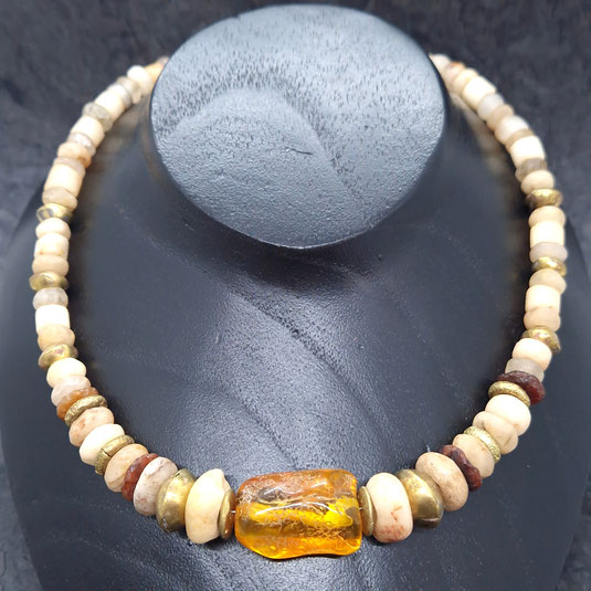 Schmuckunikat mit Bernstein Rondellen, Java Glasperle, blauer Steinkoralle, Tuareg Goldperlen und Minkmuschel!