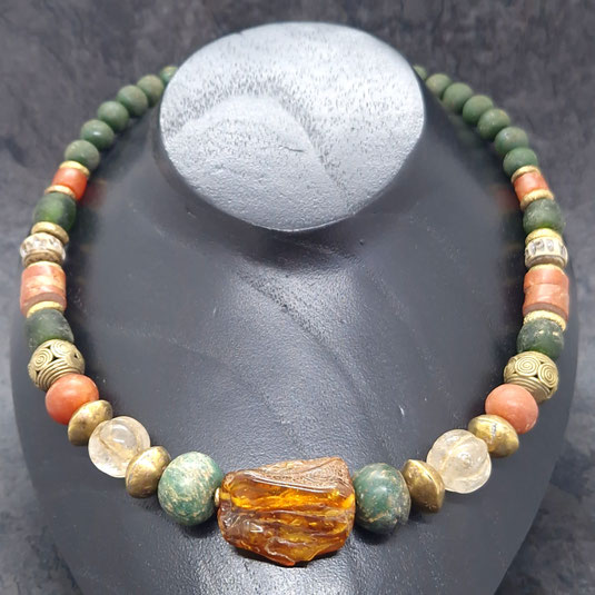 Schmuckunikat mit einer großen echten Bernstein-Perle mittig! Zwei große alte dunkelgrüne afrikanische Serpentin-Perlen, alte Glasperlen aus Nepal, antiker Karneol und Quarz aus Afrika, Bauxit,